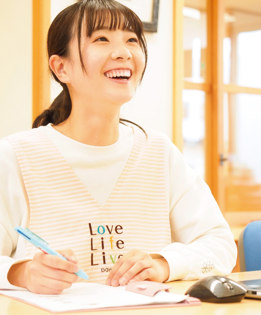 DOHENでは基本方針「2つのC.S.」「2つのE.S.」に基づき、スタッフ一人ひとりの取り組みや頑張りを認め、充実した待遇や福利厚生で働きやすい職場づくりに取り組んでいます。この恵まれた環境のおかげで、私たちスタッフはどうすればより良い支援ができるかをいつも全力で考えることができます。それは、ご利用者さまにご満足いただくことができるサービスを提供するために必要不可欠です。私はそういう職場で学び成長できることに誇りを感じています。