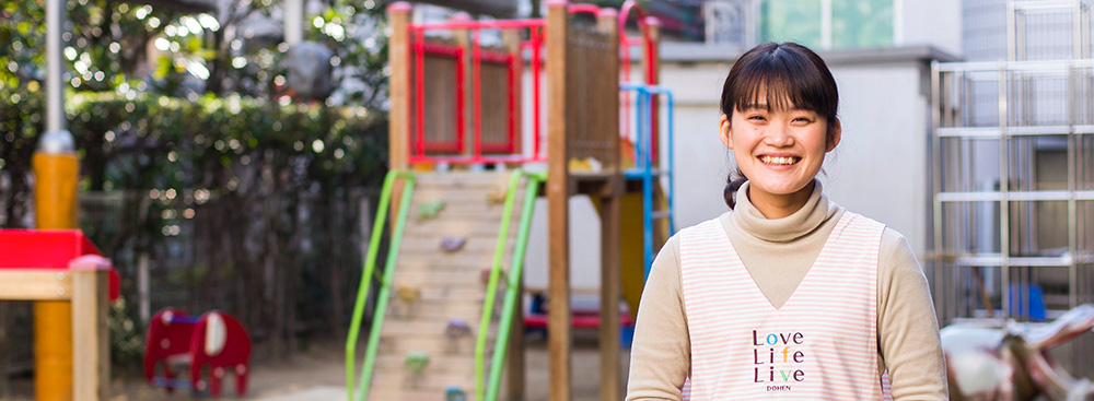 大学在学中、福祉業界で働きたいと思っていましたが、保育士とヘルパー2級の資格を取得し、保育士か介護士か決めかねていた時にDOHENに出会って入社を決めました。DOHENなら5事業を展開しているので、自分の資格を活かし幅広く活躍できると思えたからです。保育士に決まった時には、こんな自分で大丈夫かなと不安に思ったこともありましたが、かわいい子どもたちに寄り添いその成長を保護者の方と喜び合ったりするのは楽しくて、今とても充実しています。この春、私は『どうえん向島認定こども園』への転勤が決まりました。同じところに居続けると人は自分に甘くなるものです。元々尾道に興味がありましたが、この転勤をいい刺激にしてステップアップしていきたいと思います。